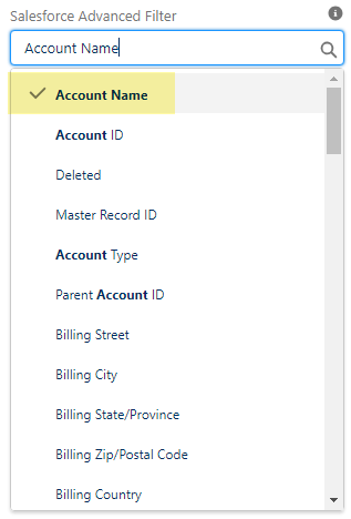 - Select the Account Name field from the Salesforce Advanced Filter drop down (all available Salesforce fields will be shown, as below)
