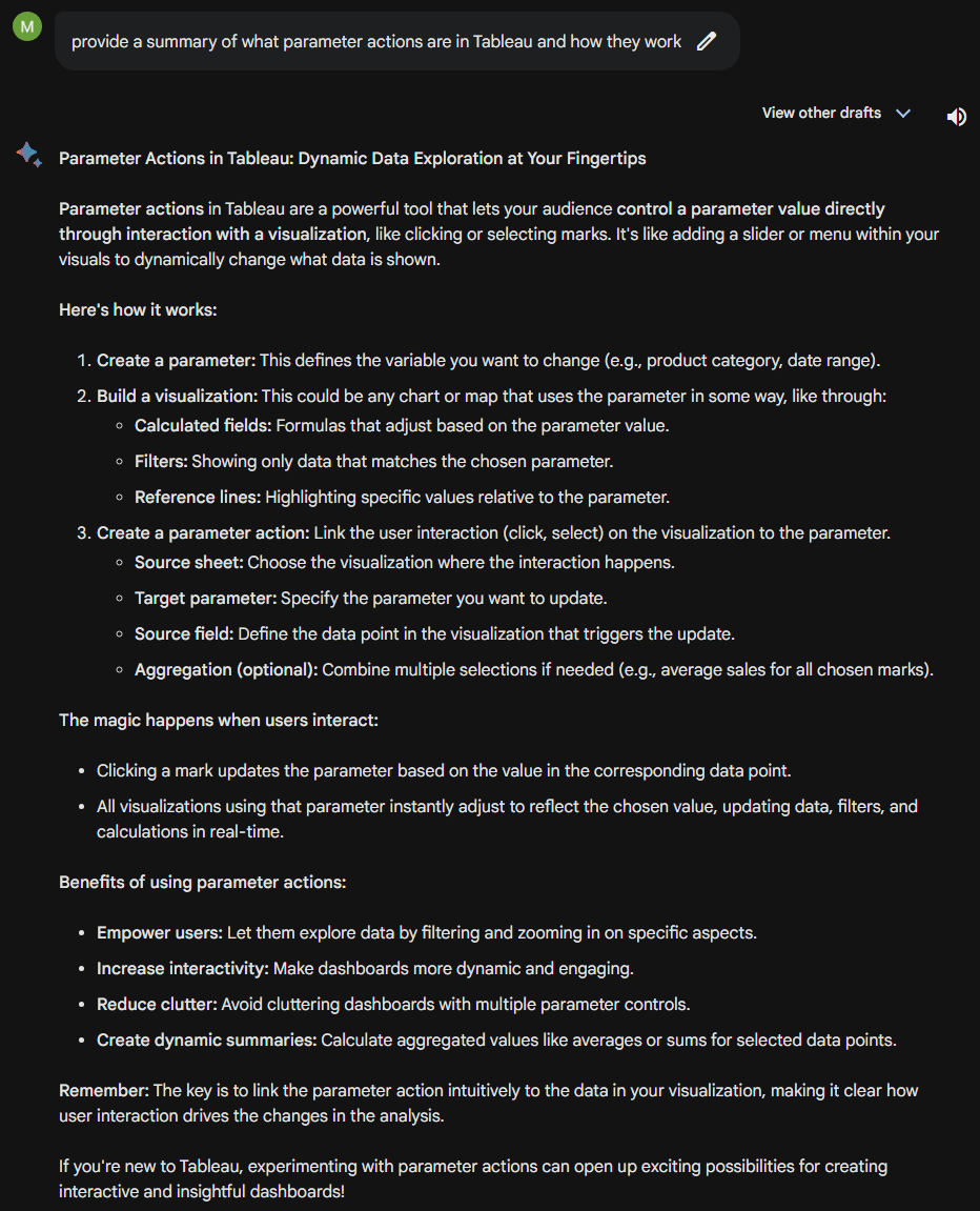 Like probably many of you reading this, I’ve used GPT/Bard to ask questions and often found the responses to be excellent, even for Tableau questions, which is a relatively niche topic. For example, as a test I gave Google Bard this prompt: